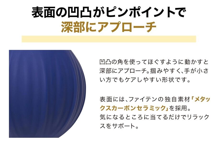 腰や背中などの気になる部位に当て、体重をかけるだけで手軽にセルフケア。首や肩などに凸凹の角を当て、ほぐすように動かすことで深部にもしっかりアプローチ。